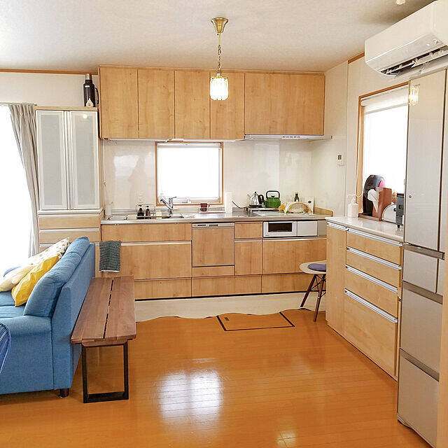 壁付けキッチンに対し、90°になるようにダイニングセットを置いているユーザーさんです。その後ろには収納棚も設置されていて、必要なものがコンパクトにまとまっていますね。テーブルのどの位置からもさっとキッチンに行ける配置で、過ごしやすそうです♪