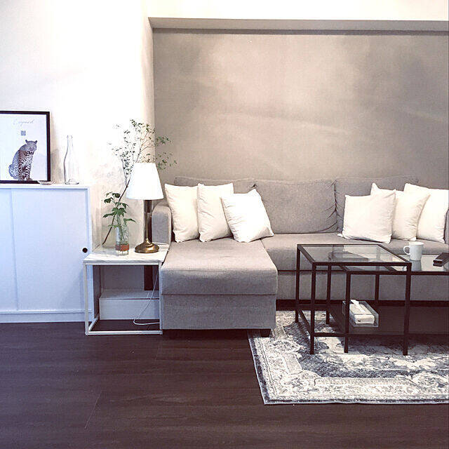 ラグジュアリーな雰囲気は、ベースカラーをホワイトや明るめのグレーにするのがおすすめです。主張しすぎないカラーは高級感が出て、落ち着いた空間に仕上げてくれます。こちらのIchirinさんのリビングは、ホワイトを中心にグレーカラーを添えた上質な印象。色を多用せずにトーンをそろえていてエレガントですね♪