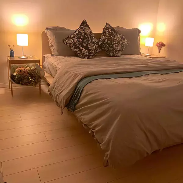 KLさんは、ホテルのようなすっきりとしたベッドルームに、優しい色合いの照明をプラスされています。強すぎない適度な明るさの光は、眠る前のリラックスタイムにぴったりですね。ベッドサイドライトにプラスして、ヘッドボードの裏にも間接照明を設置されています。