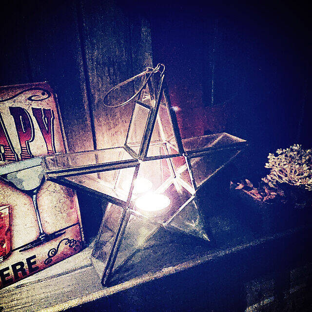 マライカのスター型キャンドルスタンドにIKEAのキャンドルを載せている実例です。暗い空間に大きなスターが浮かび上がって、おうち時間の気分も上がりそうですね。男前なインテリアにもよく馴染んでいます。