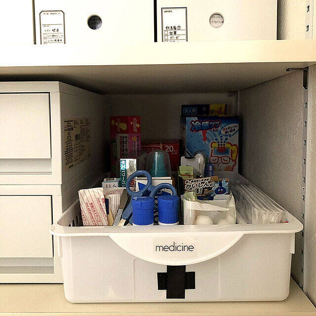 pansanさんは、薬の収納にあえて蓋のないケースを選び、廊下の収納にしまっています。浅型なので収納に入れた状態でも見渡しやすく、取り出すときもワンアクション。手前に背の低いアイテムを並べているところも見やすいです。