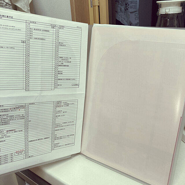 ma.homeさんは無印良品の「スリムポケットホルダーA4 10ポケット」を活用しています。こちらは全部ポケットホルダーになっているので、スムーズに出し入れできて使いやすいそう。小学校・幼稚園・習い事などの書類を程よく入れて、リビングに置いています。