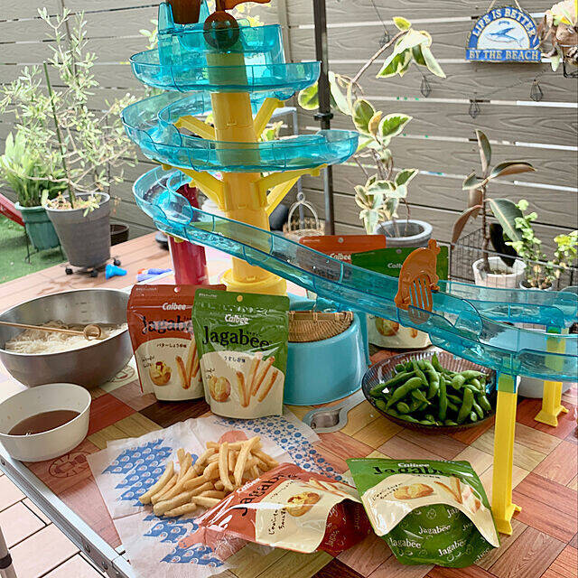 cheppyさんは、ウッドデッキにウォータースライダー型の流しそうめん機を準備して、流しそうめんを楽しんでいます。枝豆やじゃがビーなどのおつまみをつまみながら、ゆっくりと味わうことができたそうですよ!暑い日に汗を流しながら外で食べる流しそうめんは格別ですね。