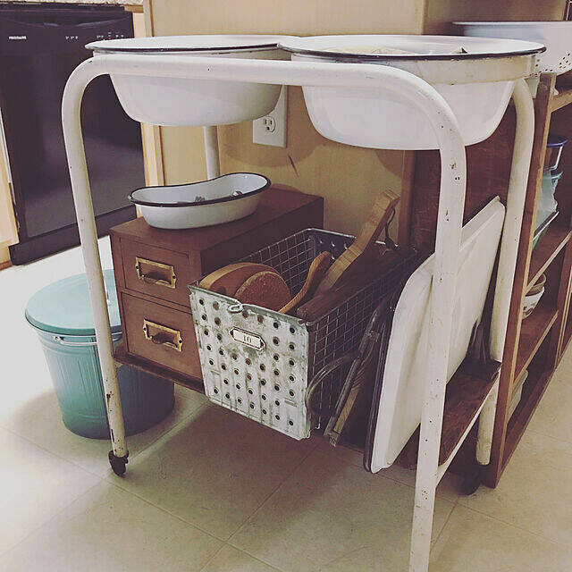megu_xxxさんはホーローのウォッシュスタンドに、エプロンや野菜を入れているそうです。ボウルの下の棚にも物が置けて、意外にも収納として優秀。キャスター付きでキッチンワゴンのようにも使えそうです。ボウルの縁取りもどこかレトロで愛らしいですね。