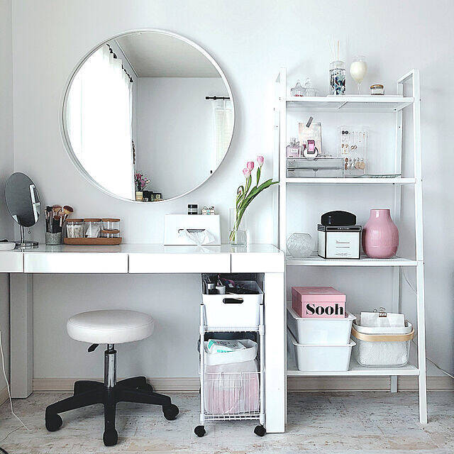物が多くなりがちなドレッサーまわりを、すっきりスタイリッシュに整えていたYayoiさん。収納のポイントは、机の下に忍ばせたジョイントラックです。ここに道具などを集結させることで、メリハリのある空間になっています。高さを調整できるので、最大限に空間を使うこともできます。