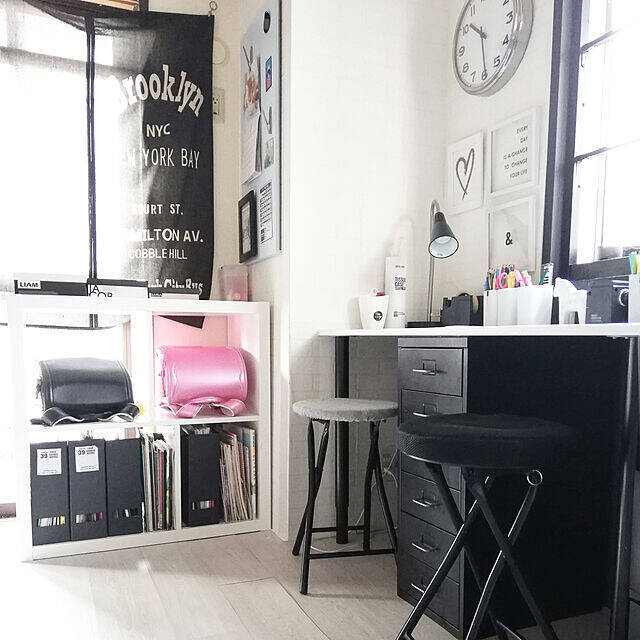 KALLAXを2つ並べて、お子さんのランドセル置き場を作ったというユーザーさんです。下の段には、教科書類を収納しています。ツインデスクもIKEAの脚と引き出しを使ってリメイクしたそうで、クールなモノトーンインテリアに仕上がっていますね。まとまりあるランドセル収納に、あこがれます。