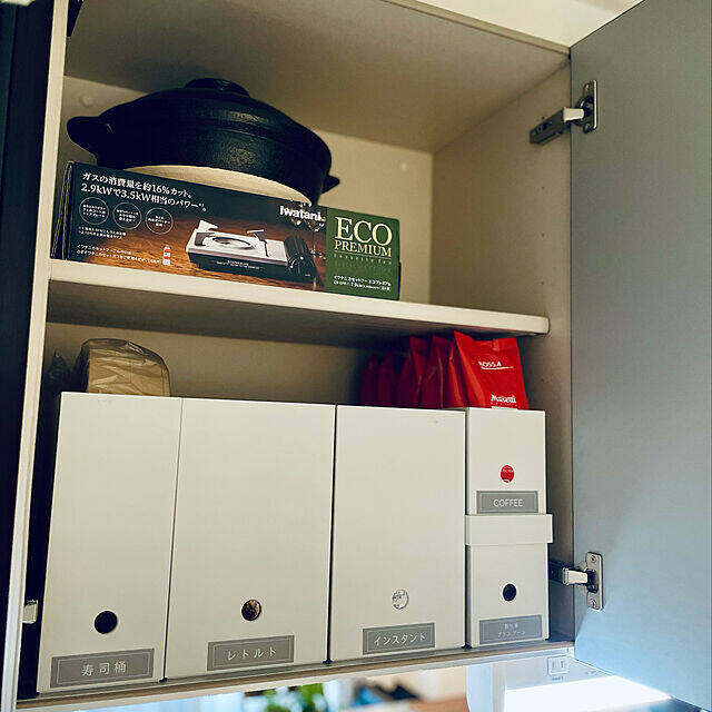 こちらのhiroさんが活用しているのは、その名も吊り戸棚ストッカー。引き出しやすいように取っ手がついていて、この取っ手はストッカーの下まで伸びているので、高い場所でも手が届きやすいのがうれしいポイントです。透明なケースにすることでパッと何があるのか、ストック量も目に見えるのがいいですね♪