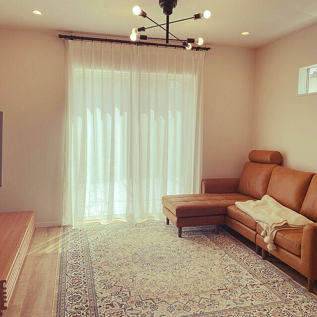 シンプルなリビングに6灯のシーリングライトを設置している実例です。ブラウンなど落ち着いた色でコーディネートされたお部屋なので、存在感のある照明がよく映えますね!窓からの太陽光もあり、明るい空間に仕上がっています。