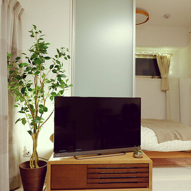 Azukiさんがテレビの横に置いているのは、ニトリで購入されたフィカスのフェイクグリーンです。近くでよく見ない限りとてもフェイクには見えないとのこと。ダストボックスを利用されているという鉢カバーが、お部屋の雰囲気にぴったりです。