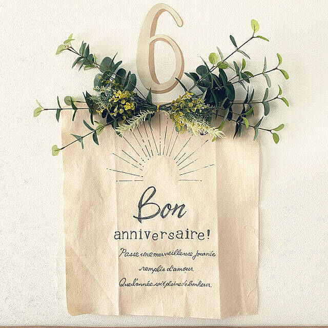 komaさんは、ダイソーの麻の布に、なんと手書きでメッセージを書かれ、フェイクグリーンをあしらって壁にディスプレイされました。フランス語の書体がとても美しく、メッセージからお子さんへの愛情が伝わる素敵な作品ですね。フェイクグリーンがアクセントになっていて、シンプルながら存在感が光っています。
