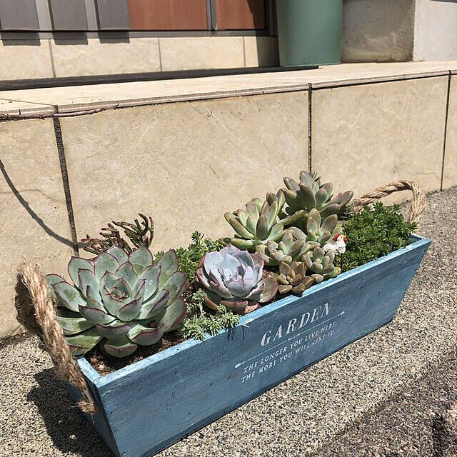 tenmaruさんは、存在感のある多肉植物を組み合わせて、ダイソーの木箱に寄せ植えされています。ナチュラルな質感の木箱に、多肉植物がほどよいバランスで配置されていて、自然の一部のような完成度の高い仕上がりですね。日当たりのよい玄関で、すくすくとグリーンが育ちそうです。