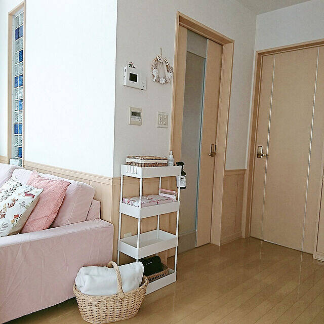 玄関近くのドア横に、スリムワゴンを置いているユーザーさんです。体温計や消毒用のジェルと一緒にマスクを置いています。マスクが入れられているのは、美しい花柄のピンクの箱の中だそう。花柄がお好きというユーザーさんのインテリアに、見事にマッチしていますね。
