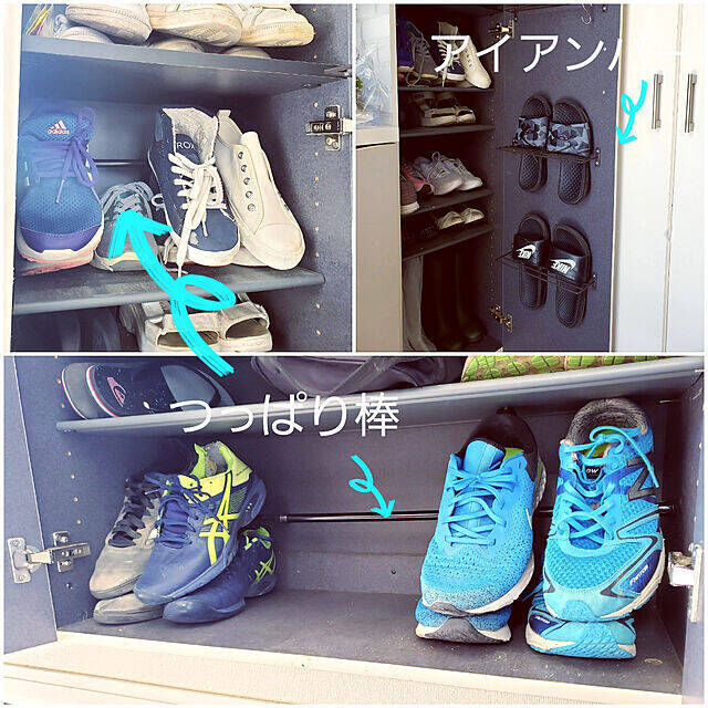 100均のつっぱり棒とアイアンバーを活用している、こちらのユーザーさん。つっぱり棒によって収納力が上がっただけでなく、靴が見やすくなっているので、迷わずスムーズに取り出せます。玄関に散乱させがちなサンダルも、指定の収納場所を作ることで、自然と片付ける習慣が身に付きますね!