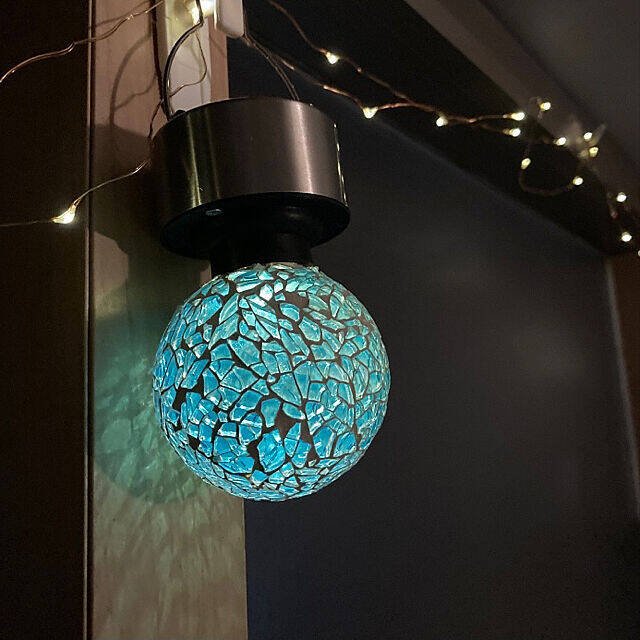 テラスの中にダイソーのソーラーライトを吊るしている実例です。モザイクガラスが美しいですね。暗闇を背景に、ブルーの輝きが映えています。存在感のあるデザインは、ひとつ吊るすだけでも効果絶大。うっとりと眺めてしまいます。色違いもあったそうです。