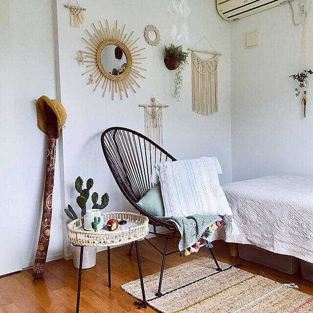 リゾートスタイルのインテリアでもよく使用されるラタンは、上品で落ち着いた雰囲気が魅力。軽い素材で場所を選ばず壁にかけられる点もうれしいですね。maroさんは、手編みならではの温かみのあるデザインが印象的な壁掛けミラーを、おしゃれなお部屋に飾られています。
