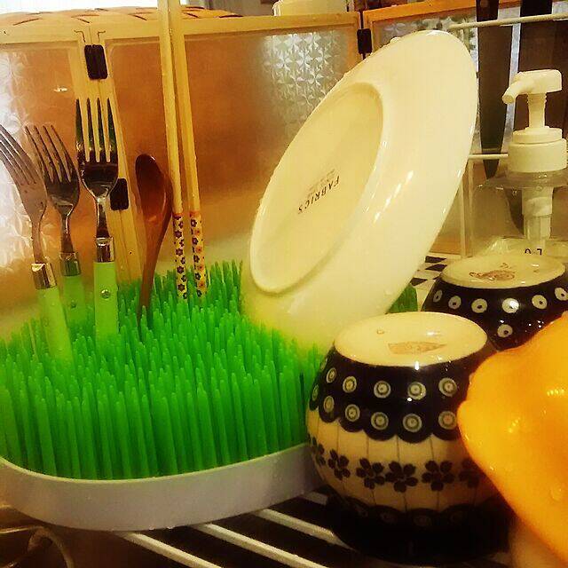 水切りかごを折りたたみ式に変えられたという、2006jsyさん。ラックのすき間からカトラリーが落ちないように、芝生型の水切りラックを利用されているそうです。哺乳瓶なども立てられるというラックには、細いカトラリーやお皿も立てて水切りができます。