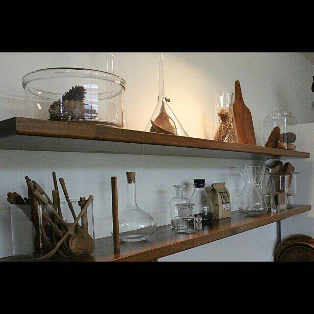 ガラスのアイテムは、理系インテリアでぜひ使いたいものの一つ。その中でもこちらの実例のように、ビーカーやフラスコを思わせる形のものは、より味のある雰囲気をアップしてくれますね。置くものを厳選したことで、ガラスの美しいラインが際立っているのもポイントです。