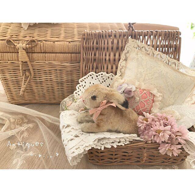こちらのユーザーさんは、シュタイフのうさぎをはじめとするシャビーシックなアイテムを小さなバスケットに詰め込まれました。柔らかな色合いで統一されたバスケットは、うっとりしてしまう可愛らしさですね。まとめたことで、それぞれのデザインがより引き立っているのも素敵です。