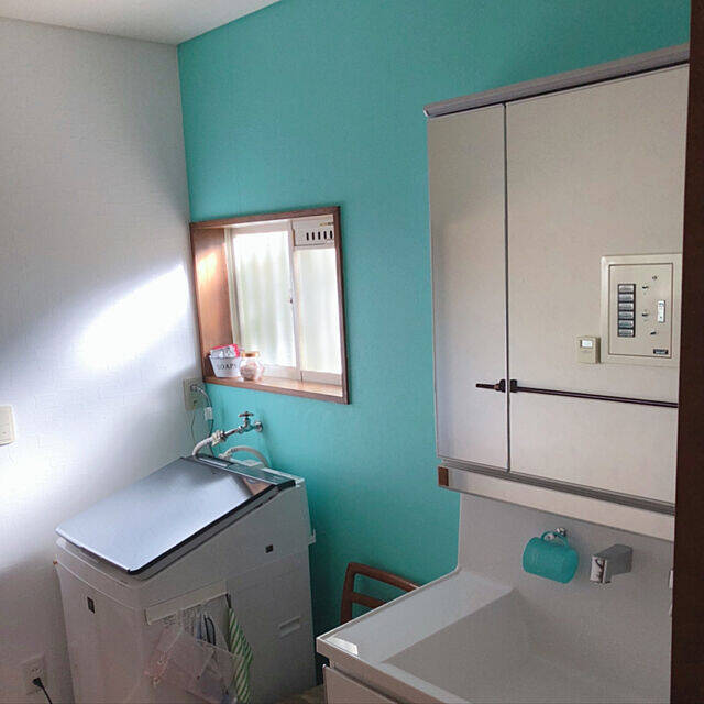 洗濯機を変えたタイミングで、洗面所の壁紙をチェンジしてみたというyutaさん。綺麗なブルーカラーのアクセントウォールが、爽やかな印象ですね。洗面所自体も明るい雰囲気になったとお気に入りのようです。カラーウォールは実例のように一面だけに使うとメリハリのあるインテリアを実現できます。