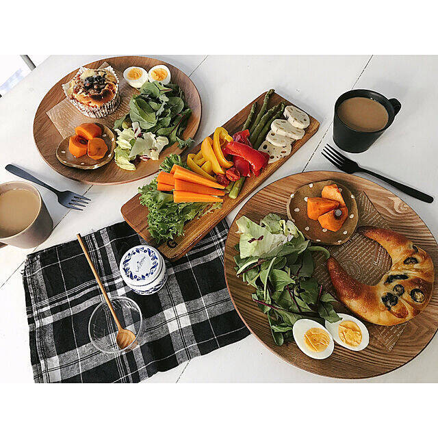 木目の大きなプレートに、パンを中心として彩りよく並べられている実例です。プレートと色味を合わせたドット柄の小皿がさりげなく効いているのがGOOD。ホワイトのテーブルと、プレイスマットやカトラリー、マグなどの濃い色が映えていて、ぐっと垢抜けた印象になっているのにも注目です。