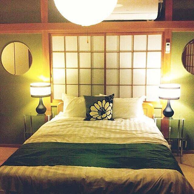 まるで旅館の一室のようなこちらの実例。ライトグリーンの土壁が襖や柱と合わせて、癒しの和の雰囲気を演出してくれています。丸いミラーや照明がモダンなテイストもプラスしていて、あこがれの和モダンに仕上がっています。