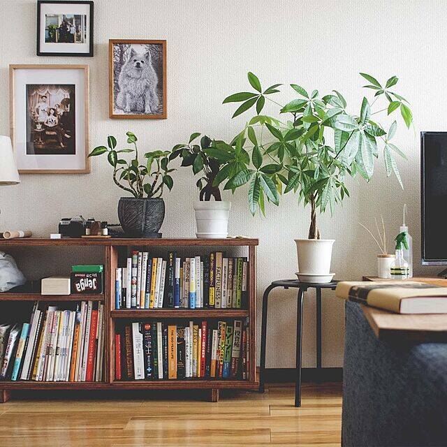 DIYが好きで欲しい家具はつくるというmasaさん。リビングに置いても圧迫感のない、ロータイプの本棚をつくりました。ほかのインテリアとも馴染みがいいシンプルなデザインが好印象。深みのあるダークな色合いは、落ち着きがあり品を感じさせます。フォトフレームやグリーンの飾り方もとても素敵ですね。
