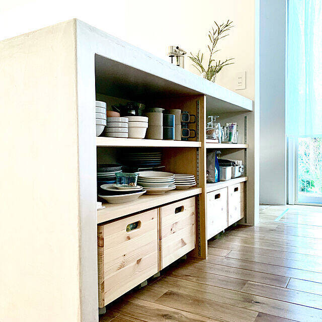 キャスター付きの収納ボックスを使い、きれいに整理された収納を叶えられているarieさん。カウンターの下をすべて無印良品のボックスでそろえているため、統一感があり美しいですね。無駄な装飾がないシンプルなデザインのボックスが、すっきりと整えられたキッチンにマッチしています。