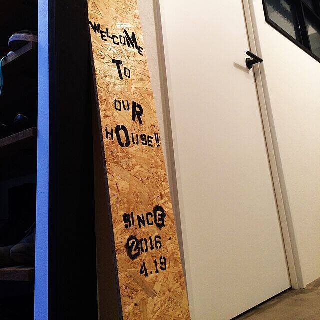 OSB合板にステンシルを施してウェルカムボードを作ったこちらのユーザーさん。ところどころ文字の大きさを変えるなど、個性あふれる仕上がりになっています。味わいのある見た目のOSB合板だからこそ、無造作に立てかけておくだけでもおしゃれに見せてくれますね!
