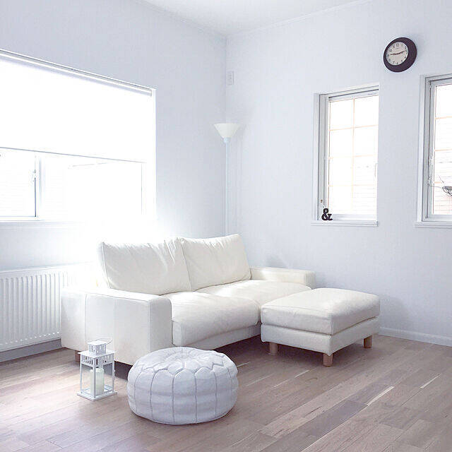 大きくて存在感のあるホワイトレザーのプフが、ホワイトで統一されたインテリアにとけこみながらも、こだわりを感じさせます。プフの縫糸の色が無印良品のレザーソファと同じ色とのこと。お部屋全体の統一感は、ユーザーさんの細やかなこだわりから作り出されているのですね。
