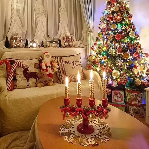 chururiさんは、アドベントキャンドルを使用されています。クリスマスまでのカウントダウンが、より一層楽しめたそうですよ♪ ツリーの装飾や窓際に並ぶミニチュアのおうちにも、あかりが灯っています。絵本から飛び出してきたような、豪華な世界観です。