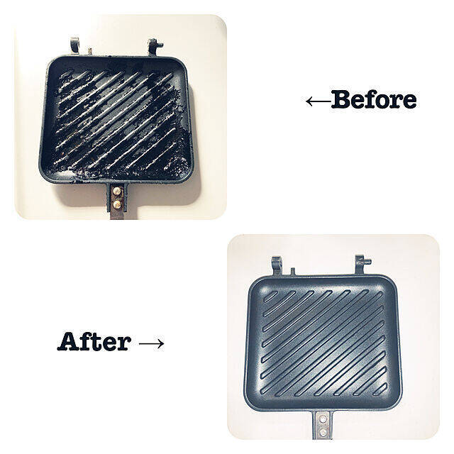 コゲついてしまったホットサンドメーカーを、オキシクリーンできれいにしたというorange-toastさん。オキシクリーンを振りかけて、熱湯につけて1時間。それを2回繰り返せば、さっぱりとキレイになったそうです。ゴシゴシこすることなくコゲがおとせるので、テフロン加工を傷つけずに手入れができるそうです。