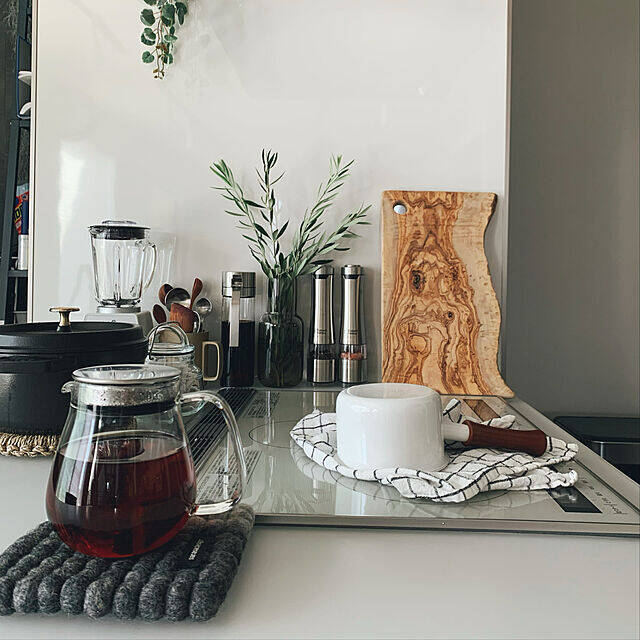 スタイリッシュで、スッキリと整ったsirotanさんのキッチンで見つけたのは、KEYUCAのミルクパンです。白いホーローに、ナチュラルな木の取っ手を組み合わせたシンプルながらあたたかみのあるデザイン。こだわりが詰まった、落ち着きのあるキッチン用品になじみ、センスの光る空間になっていますね。