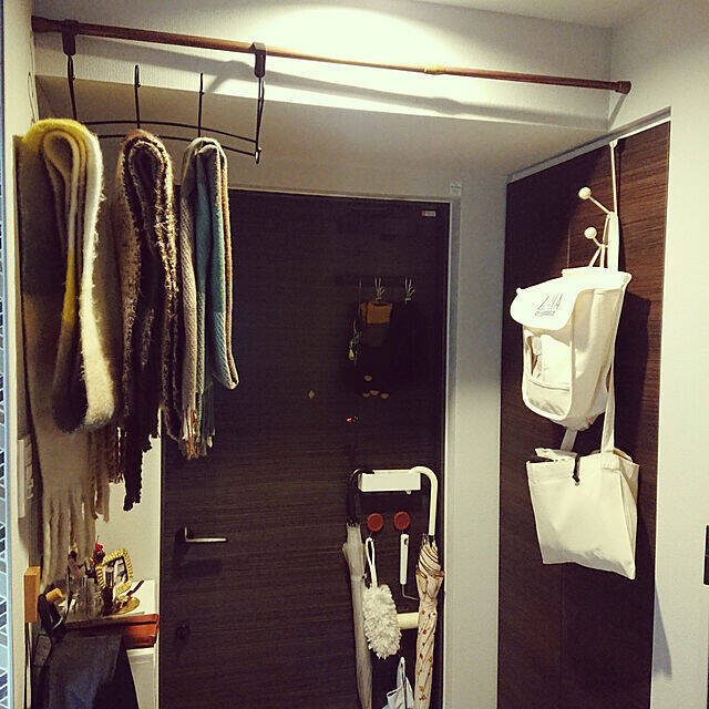 こちらのユーザーさんは、玄関の天井付近につっぱり棒を設置し、マフラー用のハンガーを引っ掛けています。高い位置にあるので邪魔にならず、玄関にあるので出かける前にさっと取り出すことができますね。マフラーの柄で、空間も華やかになっています。