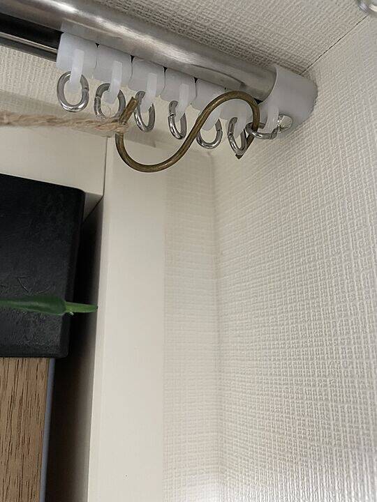 窓半面分に麻紐1本でつくりました。我が家のカーテンレールは120cmです。まず、半面分の作業をしていきます。1本の麻紐の両サイドにそれぞれS字フックを引っ掛けてください。続いて、S字フックの反対側をカーテンレールの一番端に引っ掛けます。