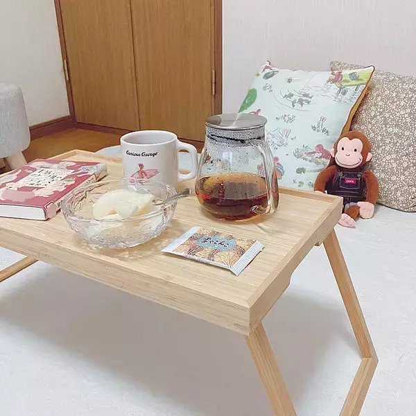 IKEAのベッドトレイを出して、休日のおやつタイムを楽しんでいるというgeorge.biscuitさん。使われているのは竹素材の「RESGODS(レスゴドス)」です。お部屋がパッと明るくなるような軽やかさがあります。コンパクトな折りたたみ式なので、必要なときだけサッと使えるのが便利ですね。