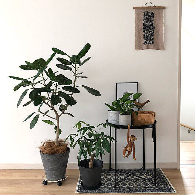 リビングの一角に飾られた、たくさんの観葉植物。.suz.. さんは、小さなグリーンをのせる台として、ブラックの「GLADOM」を使われています。ラグマットやタペストリー、プランターなども黒でまとめ、スタイリッシュにコーディネート。トレイにカイボイスンモンキーを引っ掛けた、遊び心が楽しいですね。