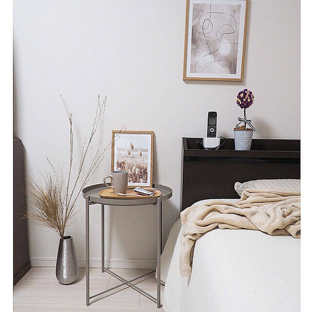 ベッドでのリラックスタイムに役立つサイドテーブル。tomatoさんが選ばれたのは、ダークグレーベージュの「GLADOM」です。大人っぽいニュアンスカラーが、ベッドまわりを穏やかに見せてくれますね。セピア色のフォトフレームやドライの枝など、落ち着きのあるディスプレイとも相性抜群です。