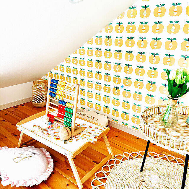 キュートな壁紙が貼られた、ワクワクするようなキッズスペース。pika.さんはIKEAのベッドトレイ「DJURA(ジューラ)」をプレイテーブルとして使われています。低めのテーブルは、お子さんが遊ぶのにちょうどいいですね。ホワイト×ウッドの明るくナチュラルなカラーが、楽しげな空間になじみます。