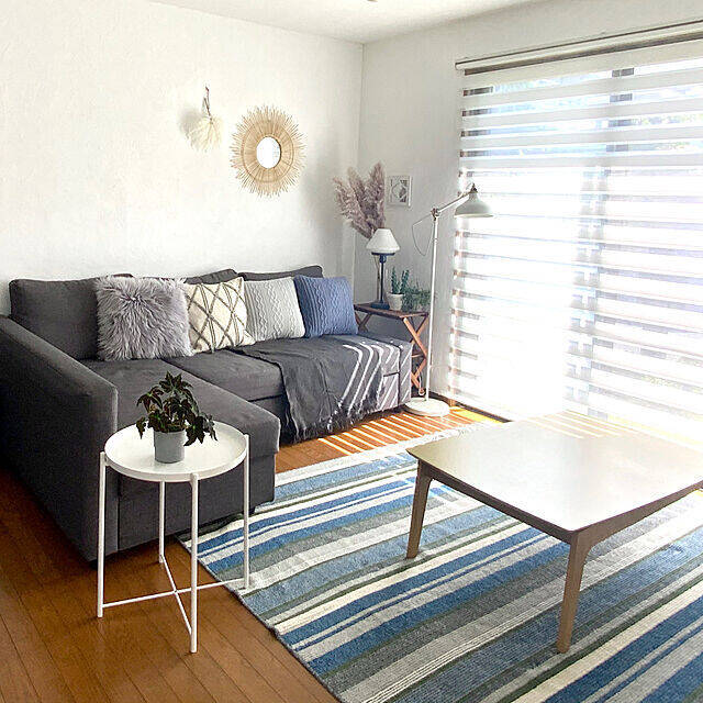 スッキリとしたホワイトカラーの「GLADOM」。白いロールスクリーンやフロアライトと共に、お部屋に爽やかさをプラスしています。blueberryさんはソファ横のサイドテーブルとして活用。天板がそのままトレイになるので、お茶の準備や片付けがスムーズにできそうですね。