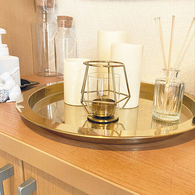 ゴールドの輝きが美しい、IKEAのトレイ「GLATTIS(グラッティス)」。LaLaさんはシューズボックス上のディスプレイに活用されています。ゴールドのキャンドルホルダーやフレグランスのガラス瓶といった、きらめくアイテムを飾り、ラグジュアリーにコーディネート。眺めるだけで気分が上がります♪