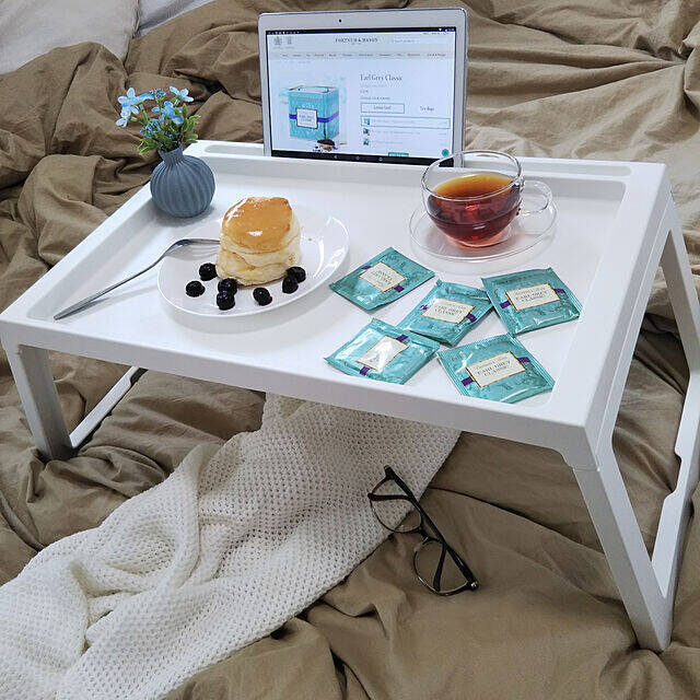 IKEAのベッドトレイ「KLIPSK(クリプスク)」は、とても機能的。天板に細い溝があって、タブレットや本を立てられるようになっています。orioriさんはタブレットをチェックしながら、ベッドの上でティータイムを楽しまれています。シンプルなデザインなので、どんな場所でも使いやすそうです。