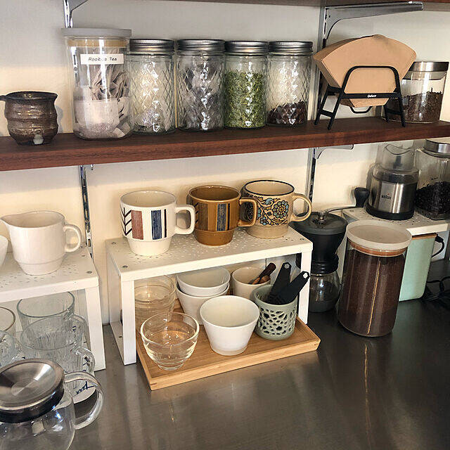 usuririさんはIKEAのトレイ「OSTBIT(オストビット)」に、よく使うカップをまとめて置かれています。丈夫でお手入れが簡単な竹素材なので、キッチンでも使いやすいそうです。のせた物をスッキリと見せる、スクエアな形も魅力。サイズは4種類で、置きたい場所や用途に合わせて選べますよ。