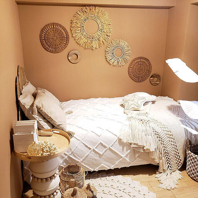 BOHOスタイルのベッドルームにマッチする、ハイセンスなサイドテーブル。mhkさんが、ニトリのサラダボウルとIKEAのトレイを組み合わせて、DIYされたものだそうです。使われているのは、バーチ材のトレイ「SKALA (スカーラ)」。大きめなので、いろいろのせられて便利そうですね。