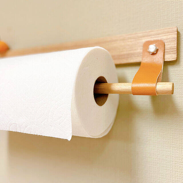 キッチンの壁にキッチンペーパーホルダーを取り付けたという、Aaaさん。100均の板とレザーの端切れでDIYされたそうです。木とレザーのナチュラルな組み合わせが相性バツグンですね。シンプルなつくりで使い勝手もよさそうです。