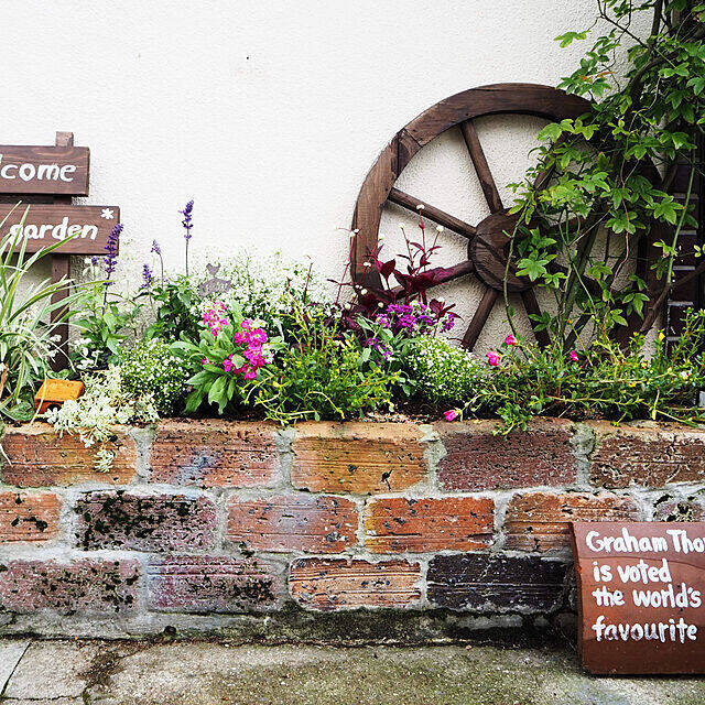 レンガを積み上げて、花壇をDIYされたmaronさん。レンガ自体にすごく味があって、シャビーな印象のかっこいい花壇に仕上がっています。小物の合わせ方もお上手なので、植物だけでなくスペース全体を眺めていたくなるくらい惹かれる空間です。少し空いたスペースなどでも試せる花壇作りアイデアです。