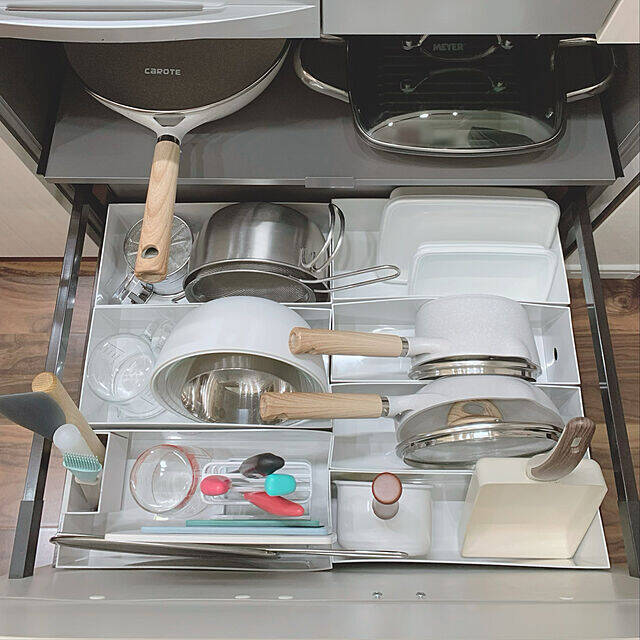 meruさんは、キッチンの引き出しを、ポリプロピレン整理ボックスで仕切って、カトラリーやキッチンツールを収納されています。アイテムのサイズに合わせたボックスで仕切られているので、使いたいものが一目瞭然ですね。アイテム同士がごちゃつくこともなく、必要なものだけがスッキリ収まっていて使いやすそうです。