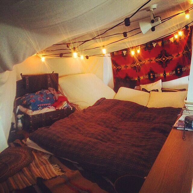 ロフトベッドルームをテント風にアレンジされているこちらのユーザーさん。天井の布はたれ具合にもこだわっていて、本当にテントの中にいるかのような気持ちになりますね。程よい明るさの照明と心地よいおこもり感で、ぐっすり深い眠りにつくことができそうです。