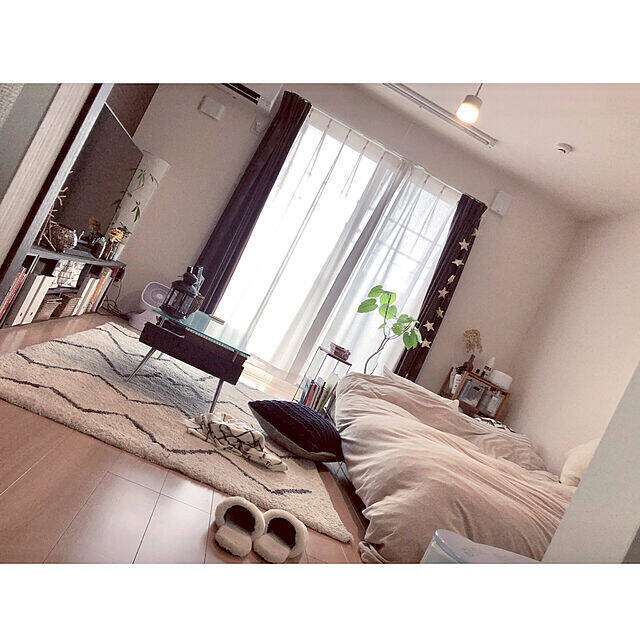 Har_さんのお部屋は北欧ナチュラルで統一されて、優しい雰囲気ですね。手前にはソファや大きめのクッションなどが置かれていて、ゆとりのある空間になっています。リビング空間から少し離れてベッドが配置されているので、落ち着いたおやすみ時間を過ごせそうです。