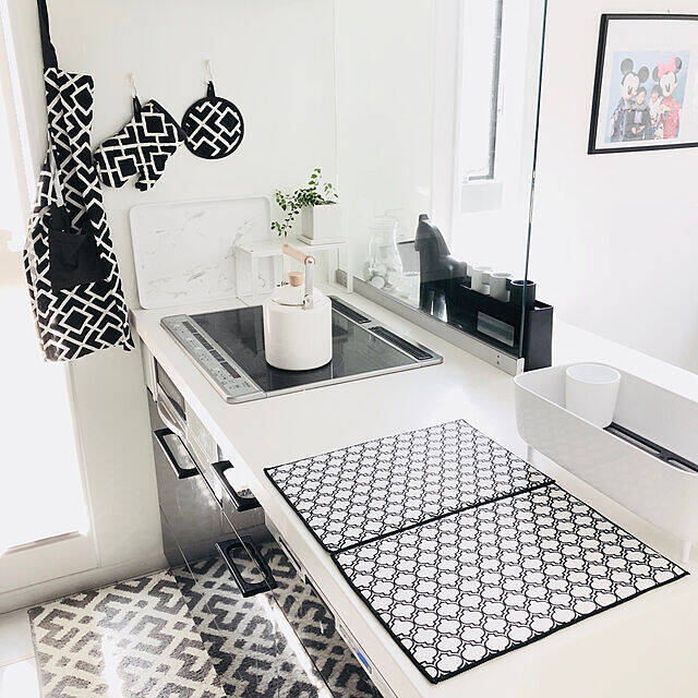 こちらの実例で使われているのはニトリの「水切りマット2点セット」です。下のマットだけでなく、スタンドもセットになっているため、このように平たいお皿は立てることができるなど機能性も抜群ですね。見た目もおしゃれでモノトーンのキッチンインテリアに似合っています。