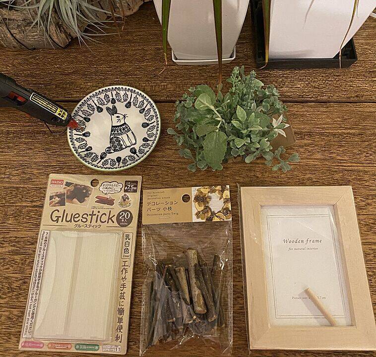 グルーガン (200円商品)【ダイソー 売場:家電】グルースティック【ダイソー 売場:家電】フォトフレーム※壁掛け可能なタイプ【Seria(セリア) 売場:装飾品】グリーンカラーマット【Seria(セリア) 売場:グリーン/ガーデニング】デコレーションパーツ小枝【Seria(セリア) 売場:グリーン/ガーデニング】つくりかた
